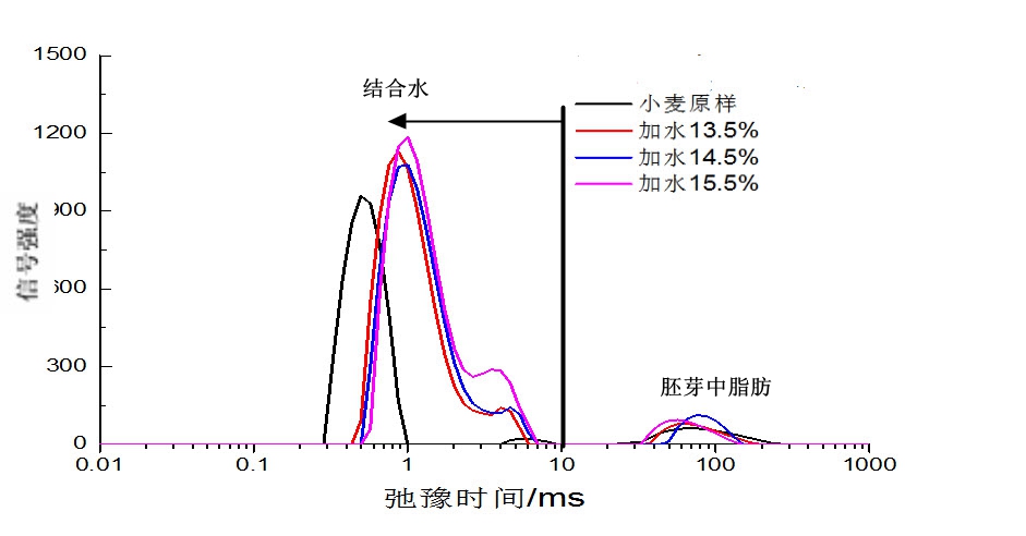 图2-1 不同加水量润麦24h后小麦的T2弛豫图谱