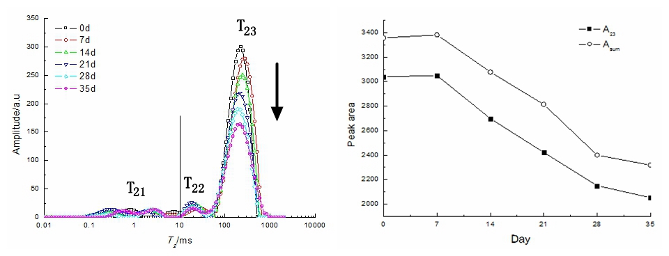 蓝莓4℃储存,其水分含量不断流失, 7天内水分含量变化较小,14天开始发现显著减少,T23峰面积(A23)和总面积A总逐渐减少,成像逐渐变暗和浅。