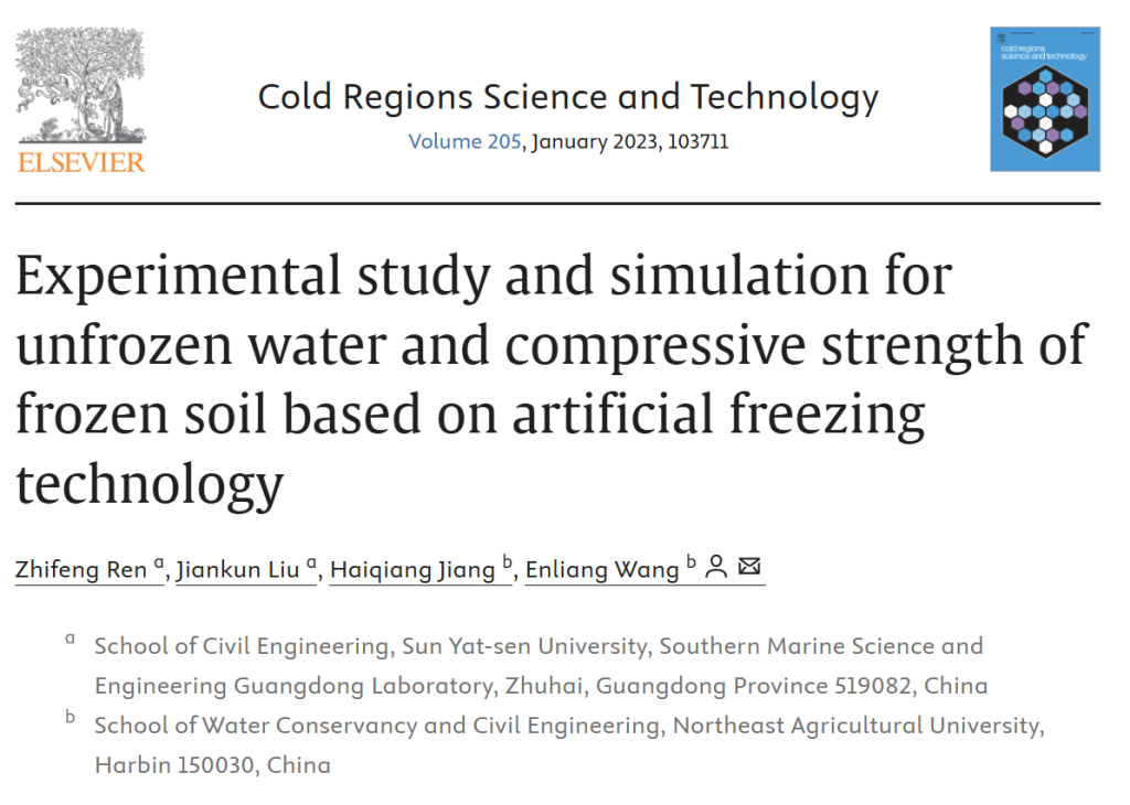 [1] Zhifeng Ren, Jiankun Liu, Haiqiang Jiang, Enliang Wang. Experimental study and simulation for unfrozen water and compressive strength of frozen soil based on artificial freezing technology[J]. Cold Regions Science and Technology, 2023, 205(103711).