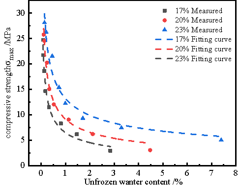 对极低温度冻土中未冻水含量与抗压强度之间的关系进行了拟合,样品的抗压强度及拟合曲线如图6所示。土壤中未冻水含量直接影响冻土的强度。从水的分子热力学角度来看,液态水分子始终呈现无序的布朗运动,其相应的动能与温度相关。温度越低,动能越小。在零度以上时,土壤中的水为液态水,其黏度极低,容易从缝隙中被挤出,由此产生的土壤强度较低。当土壤温度低于水的冰点时,土壤中的水转变为冰晶并逐渐形成冰体。随着温度的降低,土壤中的水达到冰点并形成小分子团,成为结晶中心。随后,这些小分子团成长为稍大的聚集体,称为晶核。最终,这些小聚集体结合生长,产生冰晶。冰晶在液态水膜与土壤颗粒之间形成,增加了土壤的凝聚力。随着温度的降低,未冻水含量减少,液态水膜变薄,润滑作用减弱,摩擦力增大。根据试验数据推测,随着温度的降低,几乎所有未冻水都转化为冰,抗压强度达到最大值。温度继续降低时,抗压强度保持不变。后续将开展相关研究以验证这一推测。